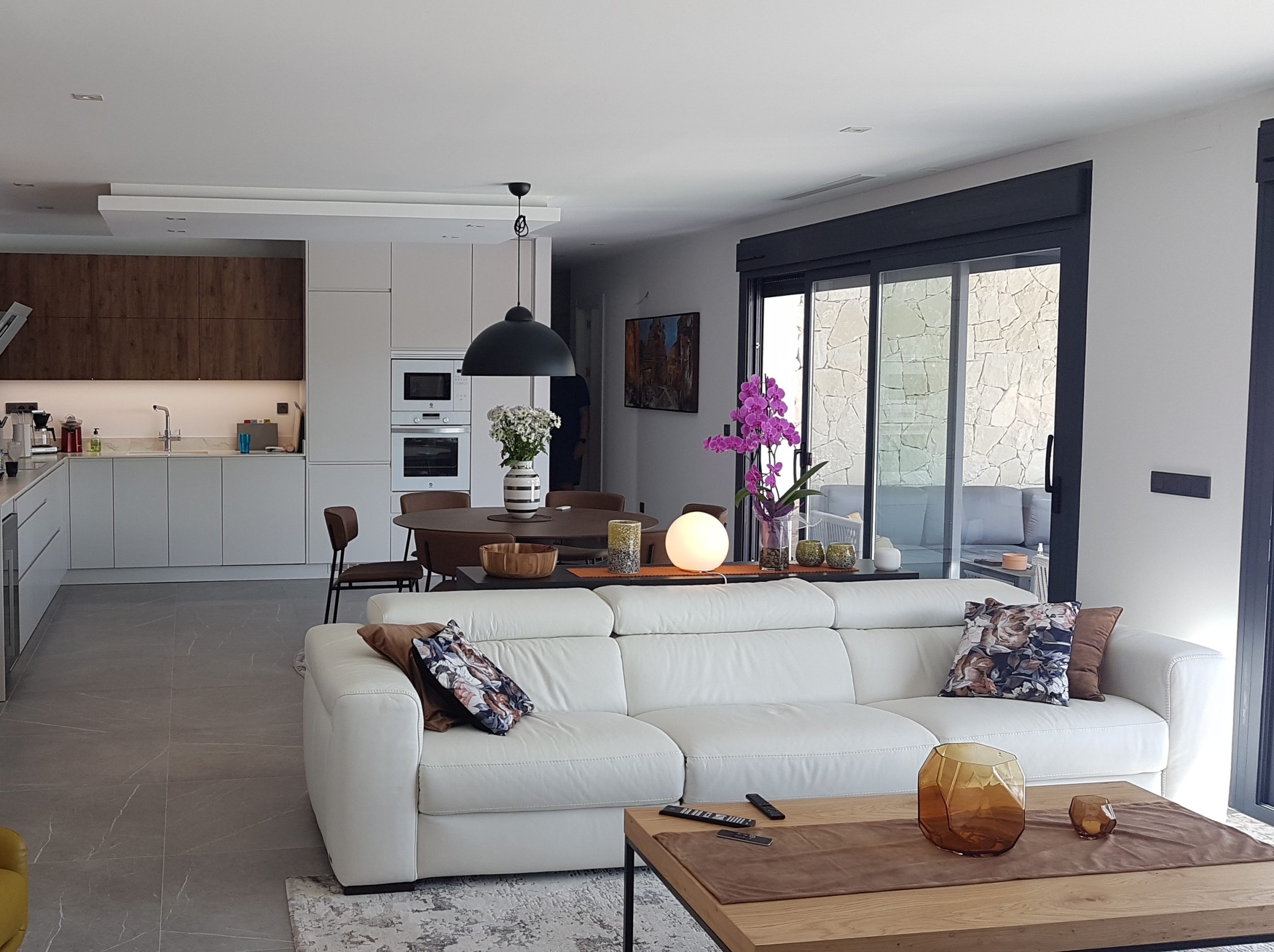 La vivienda cuenta con una zona de día completamente pensada para la convivencia y el esparcimiento, ideal para compartir momentos en familia o con amigos. Los grandes ventanales que conectan este espacio con el exterior no solo aportan luz natural, sino que brindan unas vistas impresionantes de la piscina y los jardines, creando una atmósfera de relajación.